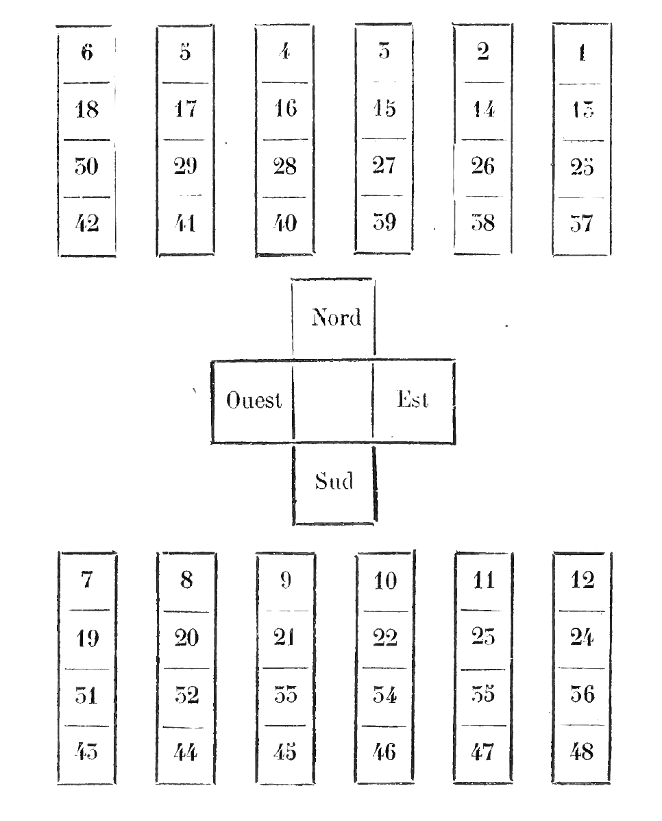Οι τρεις πρώτες στήλες επηρεάζονται από τον βορρά, την επάνω κάρτα του σταυρού. Οι τρεις επόμενες επηρεάζονται από την ανατολή, την δεξιά κάρτα του σταυρού. Στην κάτω σειρά, οι τρεις πρώτες στήλες επηρεάζονται από την δύση, την αριστερή κάρτα του σταυρού. Οι τρεις κάτω δεξιά στήλες επηρεάζονται από τον νότο, την κάτω κάρτα του σταυρού.